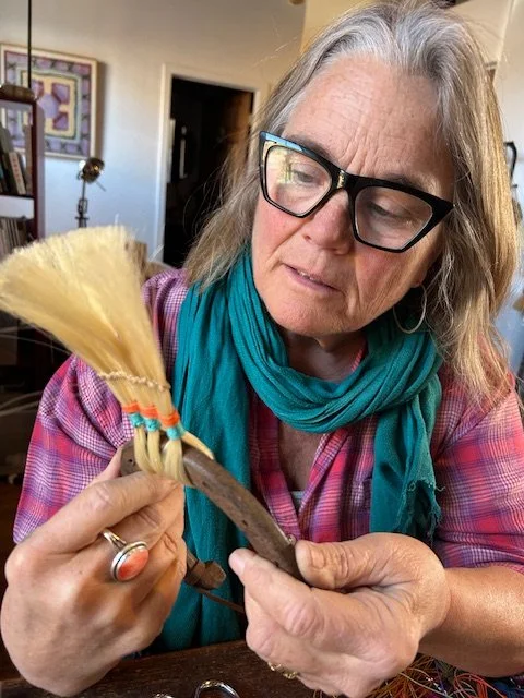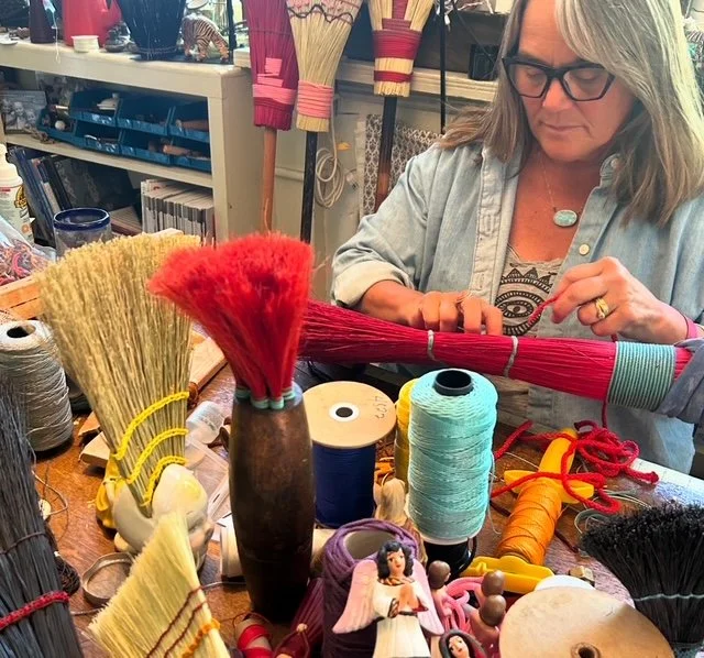 About Julia Dickenson: Julia Tait Dickenson arrived in Santa Fe in 1985 with a degree in studio arts and ceramics. Here she discovered a passion for jewelry and metal smithing, ultimately opening her own jewelry business, Thin Air Studio. In 1995 Julia moved to Vermont where she raised her family and continued her jewelry work. After 25 years, she is back in Santa Fe. During her 40 years as a maker Julia’s studio space has evolved to reflect her various creative endeavors: jewelry, ceramics, textiles, printmaking and now brooms and brushes. Guided by the phrase “Elevate the Ordinary” her brushes and brooms are meant to be used. She combines traditional broom making processes with local found objects (handles, balls, tools, etc) that feel good in your hand. Now as Thin Air Goods, Julia brings beauty and soul into objects intended for everyday use.