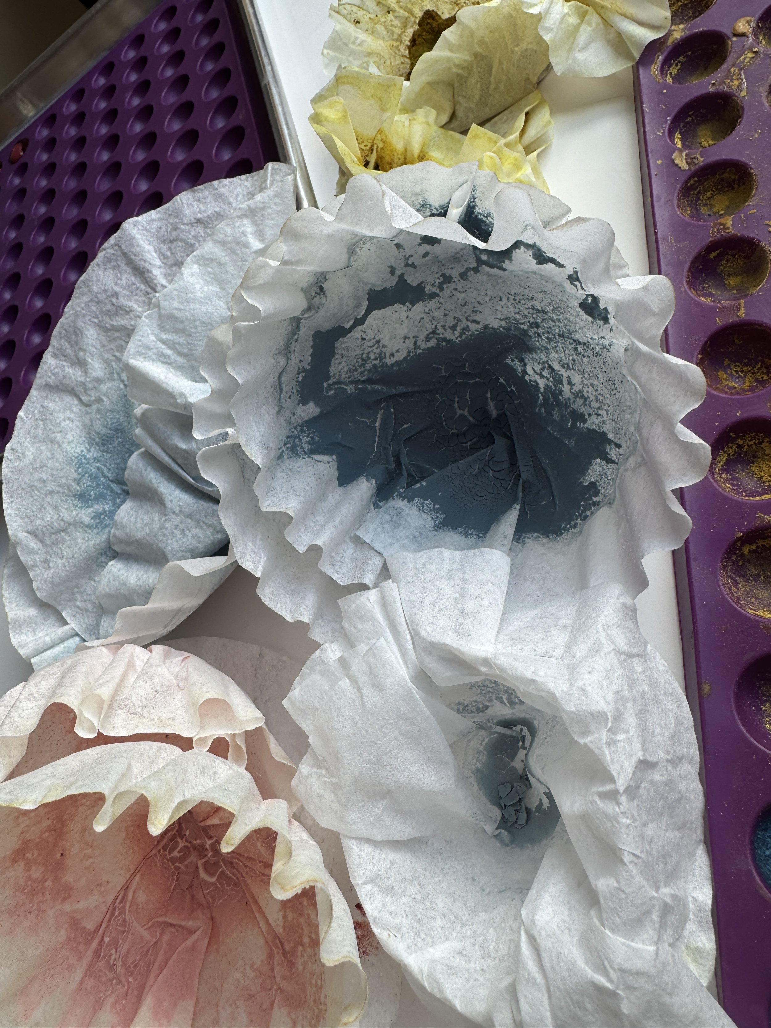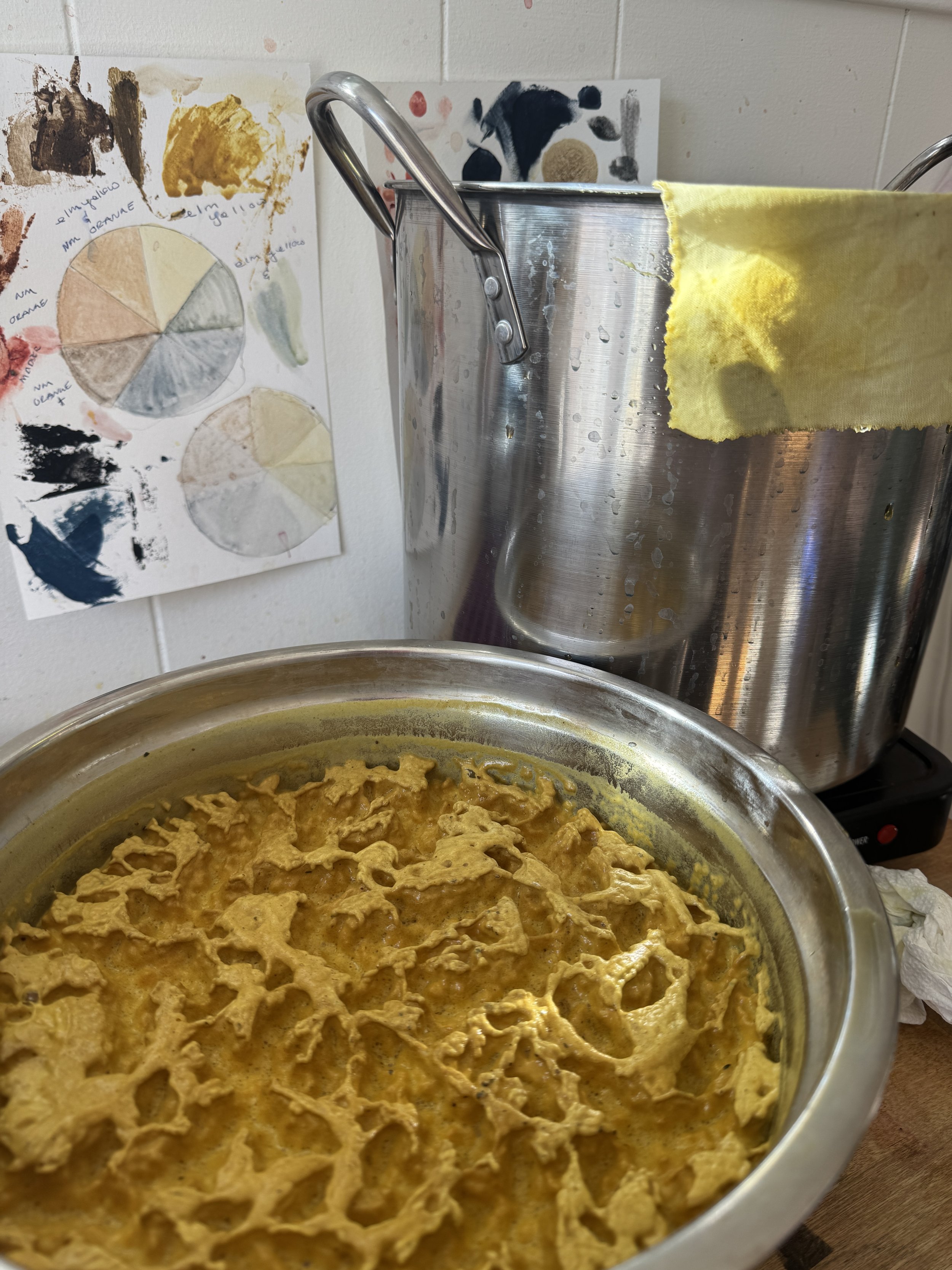 First, students will learn how to make lake pigments from existing dye baths. This includes adding alum and washing soda to the dye bath and watching the flocculation take place! This transforms soluble natural dyes into insoluble pigments by bonding with them inorganic materials. We'll watch the pigment settle, and wash the pigment.