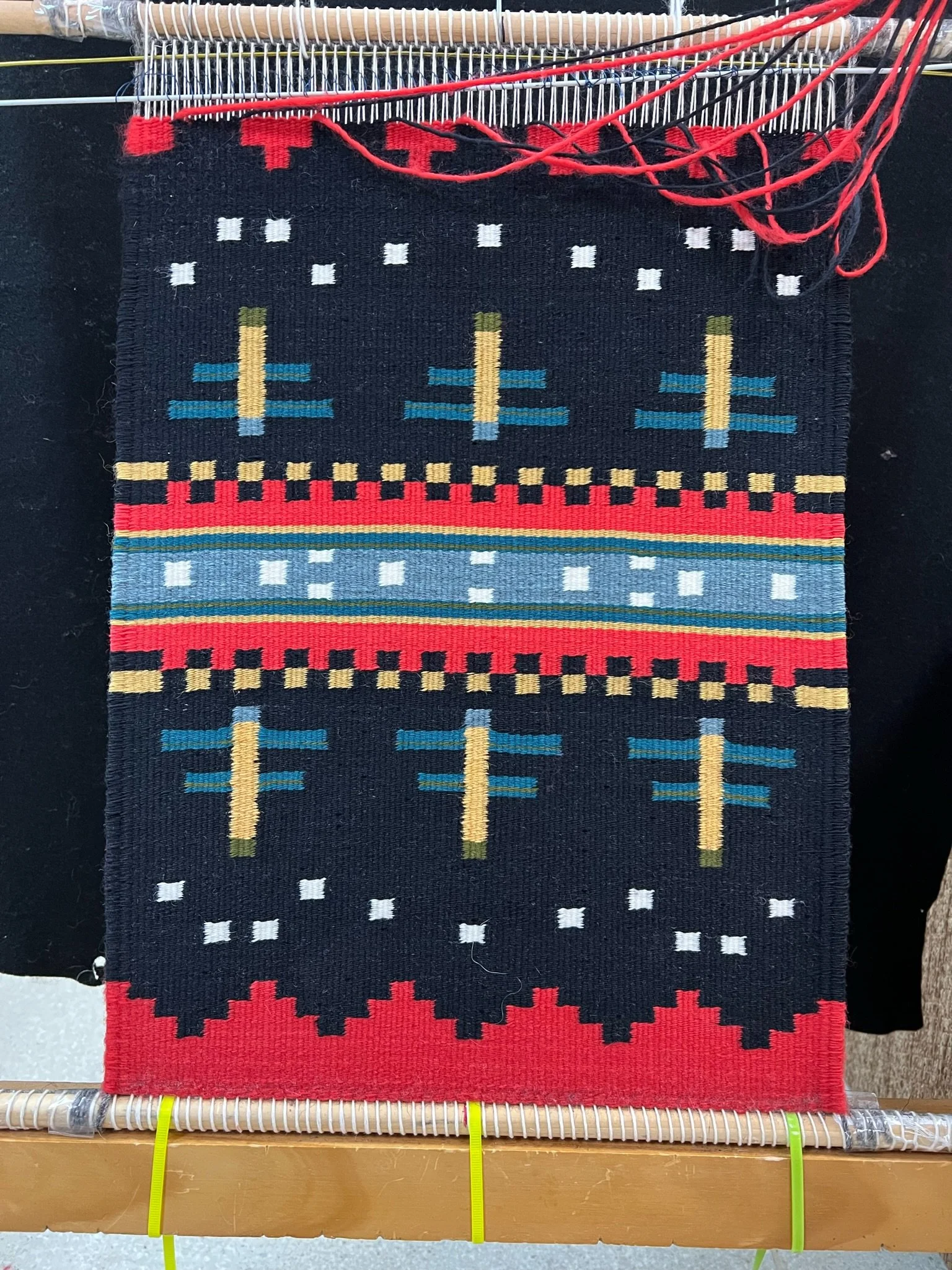 About Lynda Pete: Diné tapestry weaver Lynda Teller Pete was born into the Tábąąhá (Water Edge Clan) and born for the Tó’aheedlíinii (Two Waters Flow Together Clan). Her maternal grandfather is Born for Red Bottom People, Tł’ááshchí’í and her paternal grandfather if of the One-Walks-Around Clan, Honágháahnii. Originally from the Two Grey Hills, Newcomb, NM areas of the Navajo Nation. She lives in Denver with her husband Belvin Pete.